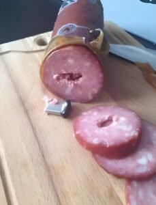 Το επόμενο πρωί, καθώς ετοίμαζα το πρωινό, πήρα ξανά το σαλάμι και άρχισα να το κόβω. Τότε παρατήρησα κάτι παράξενο: η υφή του δεν ήταν ίδια, σαν να υπήρχε κάτι σκληρό στο εσωτερικό. Σκέφτηκα ότι ίσως ήταν απλώς πολύ παγωμέν