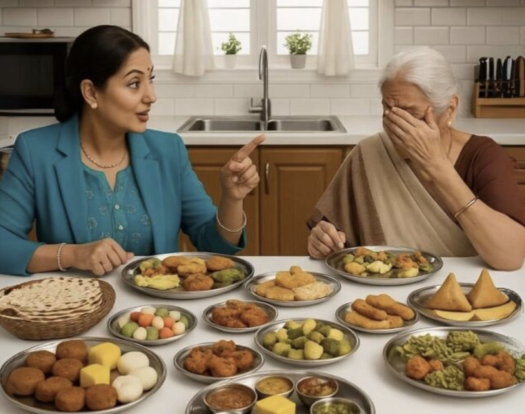 Am privit-o direct pe doamna Malhotra. „Doamnă, sunteți oaspetele nostru, dar trebuie să spun ceva. Mama mea a adus legume pentru nepotul ei. A fost trimisă în bucătărie.